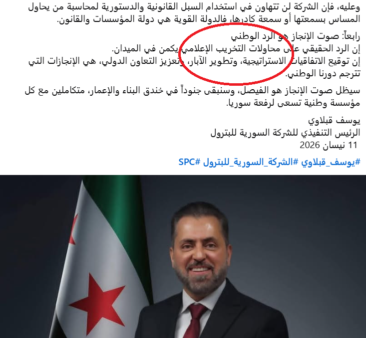 يوسف قبلاوي الرئيس التنفيذي للشركة السورية للبترول يتهم الزملاء الصحفيين بـ “التخريب الإعلامي” على طريقة بشار الأسد لتغطية الفساد والمحسوبيات المستشرية في قطاع النفط، هذا عدا عن التفاخر الذي أبداه قبل يوم واحد بتعاون مع الشركات الأمريكية لتنفيذ عمليات تنقيب في المياه الإقليمية السورية والتي تحتاج لموافقة الشعب السوري!
